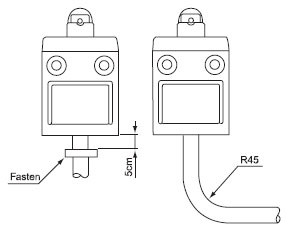 | Fastening of the switch cable The switch bodies are filled with resin for sealing purposes. To avoid stressing the cable and switch body, fasten the switch at 5 cm or farther away from the switch body, should the wire be bent, the bending radius shall be at least 45mm. |